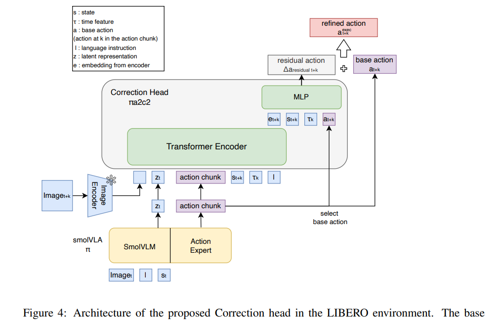 LIBERO Spatial에서는 VLA 모델 중 경쟁력이 높은 SmolVLA를 base policy로 사용하였습니다. Correction head는 transformer encoder와 lightweight MLP로 구성됩니다.