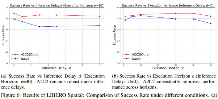 dynamic KINETIX task suite(12개 task)와 LIBERO SPATIAL 실험에서, 이 방법은 delay 증가와 horizon 증가 전반에서 일관된 success rate 향상(+23%p 및 +7%p, RTC 대비)을 보였으며, delay를 주입하지 않은 상황에서도 긴 horizon에서의 강건성을 개선합니다. 이러한 결과는 A2C2가 고용량 chunking policy를 real-time control 환경에 배치하기 위한 효과적인 plug-in 메커니즘임을 보여줍니다.