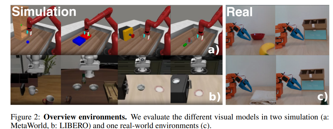 - 로봇 조작을 위한 다양한 유형의 visual reprensentation을 평가할 수 있는 통합 프레임워크를 개발하고 이를 open-source로 공개합니다. 본 연구에서는 global, dence, object-centric representation을 포함한 7개의 서로 다른 visual encoder를 대상으로, 두 개의 시뮬레이션 환경과 새롭게 제안하는 손쉽게 재현 가능한 실세계 task 세트 전반에서 benchmark를 수행합니다.