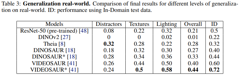 실세계 평가 결과(Table 3)에서도 VIDEOSAUR*는 texture 및 조명 변화 하에서 성공률 감소가 가장 적어 강한 강건성을 보입니다. Theia는 distractor 시나리오에서는 다시 가장 좋은 성능을 보이지만, 다른 shift에서는 실패합니다. ResNet-50은 texture와 조명 변화에 대해 예상외로 좋은 회복력을 보이지만, 모든 shift 전반에서 일관된 성능을 유지하지는 못합니다.