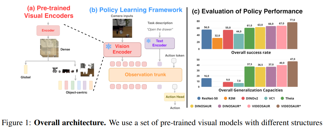 본 연구의 프레임워크의 개요는 위 그림 1에 있습니다. sensor encoding module(Vision encoder), 서로 다른 modality(예: instruction을 위한 text)를 통합하는 observation trunk, 그리고 최종 action을 예측하는 action head로 구성됩니다. 먼저, video를 위한 object-centric representation과 visual encoding을 위한 그 변형들을 소개한 뒤, policy learning을 설명합니다.