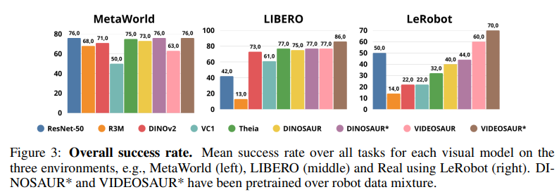 Figure 3은 MetaWorld, LIBERO, 그리고 실세계 benchmark 전반에서의 평균 성공률을 요약합니다. Object-centric model—특히 VIDEOSAUR*—은 일관되게 가장 높은 전체 성능을 달성하며, dense 모델(예: DINOv2, Theia)과 global 모델(예: ResNet-50, VC-1) baseline을 상회합니다.